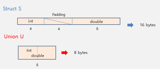 union 같은 경우 하나의 공간이 있으면 int 또는 double이 들어간다. 즉, 한 번에 하나의 타입만 들어가서 사용할 수 있다는 것이다.