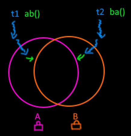 각각의 thread는 mutex A, mutex B를 먼저 획득한다. 이어서 두번째 mutex를 획득하려고 하지만 모든 mutex가 이미 lock이 되어있기 때문에 t1은 mutex B를 획득하지 못하고 t2는 mutex A를 획득하지 못하는 상태가 된다. 이렇게 서로가 서로의 lock이 해제가 되길 영원히 기다리는 Deadlock 상태에 빠지게 되는 것이다.