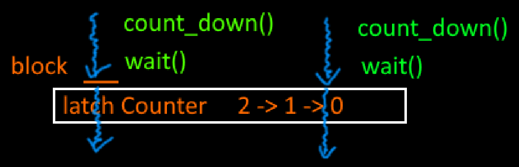 이 후 다른 쓰레드가 진행되면서 count_down()을 하면 latch의 카운트는 0이 되고, 카운트가 0이 되면서 block되었던 쓰레드가 깨어나서 자신의 일을 진행하게 된다. 이어서 count_down()을 마지막으로 호출한 쓰레드가 wait()함수를 호출하여도 이 때 카운트는 0이기 때문에 block에 빠지지 않고 자신의 일을 계속 수행하게된다.
