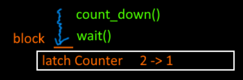 쓰레드들이 일을 수행하는데 처음 latch의 count_down() 함수를 통해 카운트가 1로 감소하고 wait()함수를 통해 해당 쓰레드는 block이 된다.